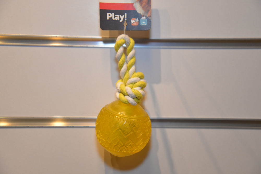 Plastboll i rep som gör det lätt att kasta eller ha lite dragkamp med din hund. Bollen är flytande.